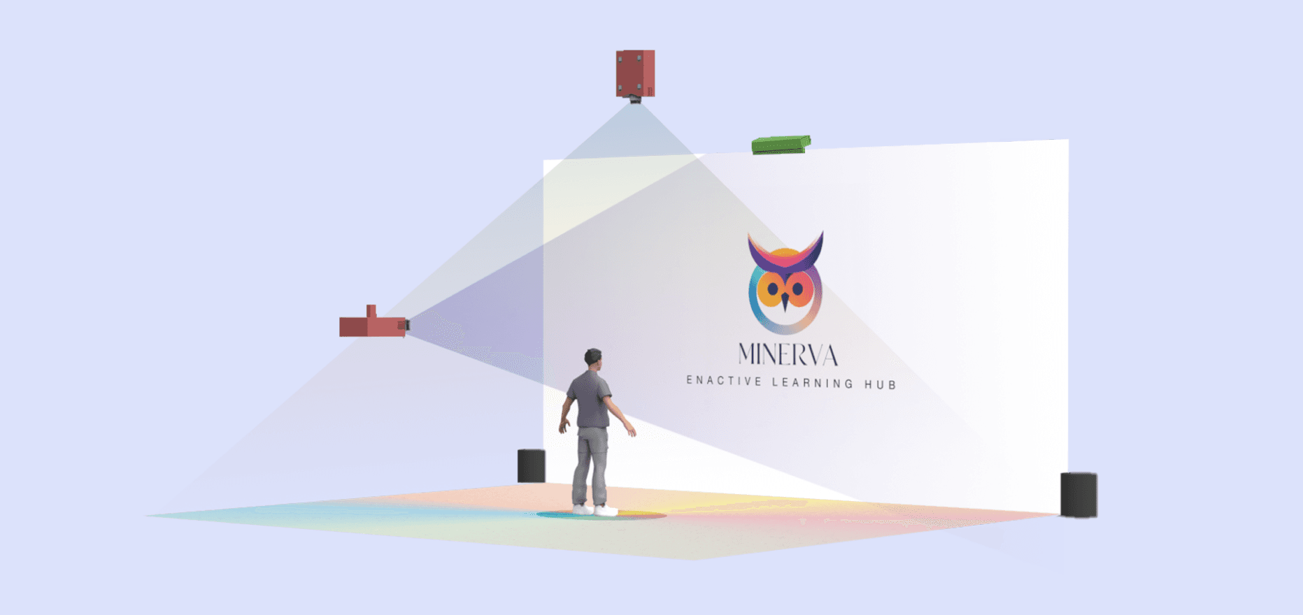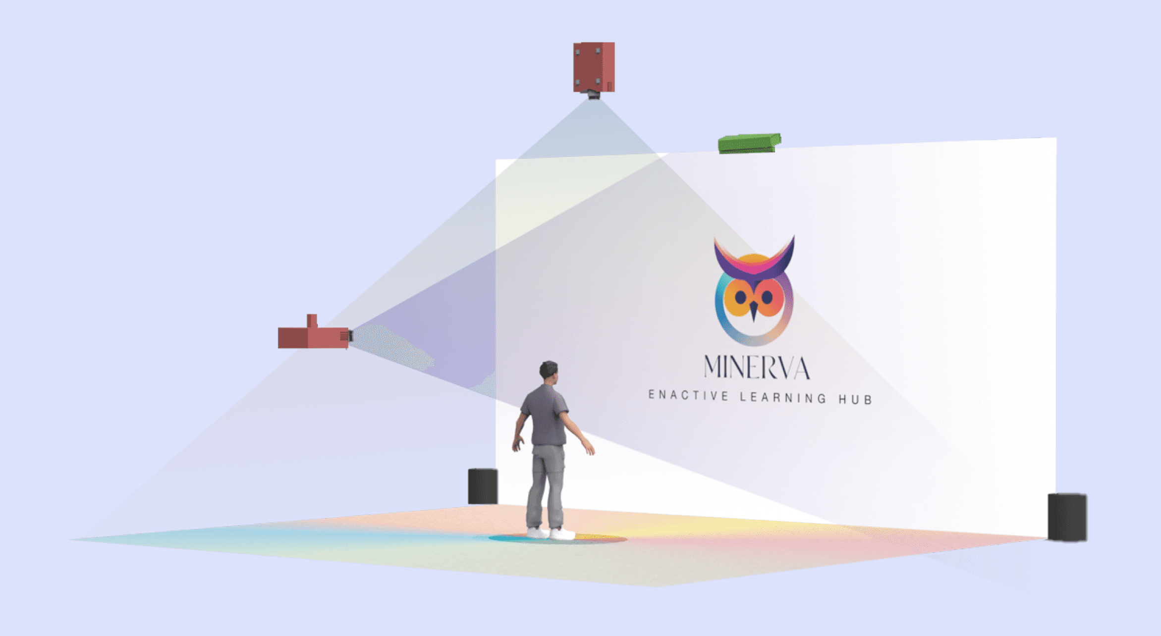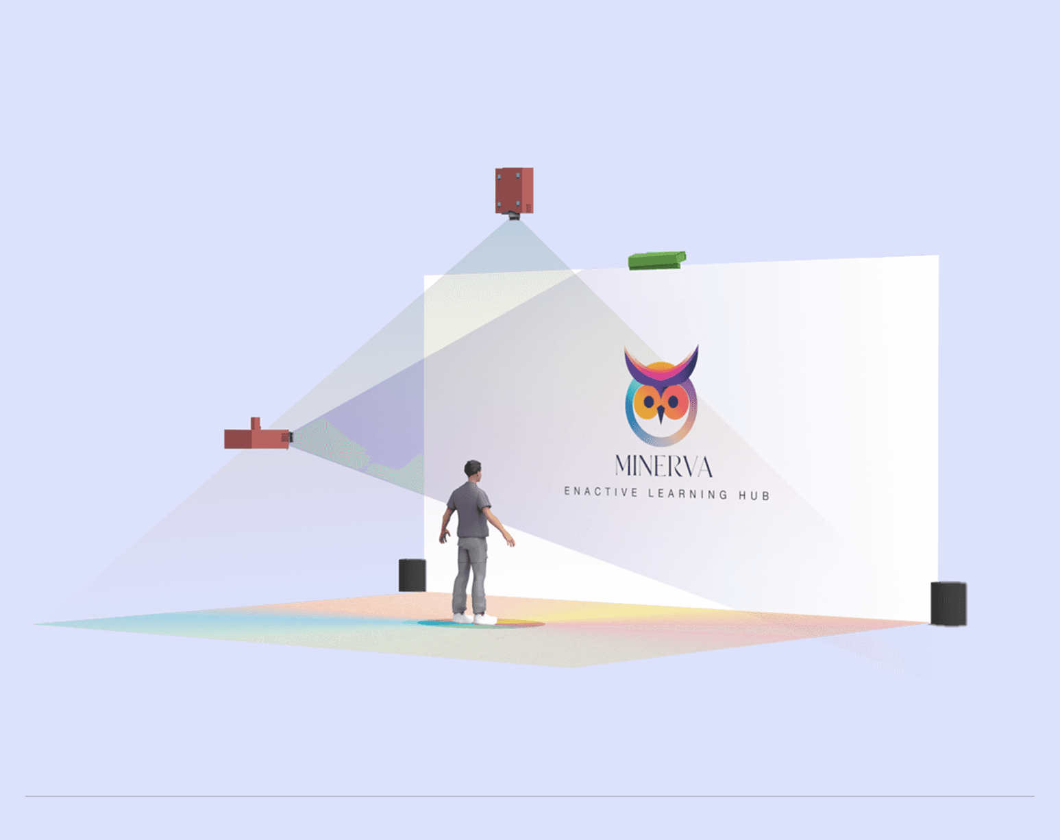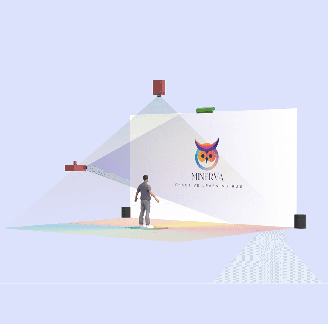 Minerva operates within a calibrated immersive installation combining dual projection mapping, Xbox Kinect 2 (Azure) motion tracking, and a Pharus laser tracking system. Two projectors transform the floor and wall into a seamless interactive environment, while the Kinect captures full-body skeletal movement. The Pharus system ensures precise spatial positioning within the space. Together, this layered tracking architecture enables real-time environmental response to a child’s gestures, movement, and posture keeping the technology invisible while the experience remains fully embodied.