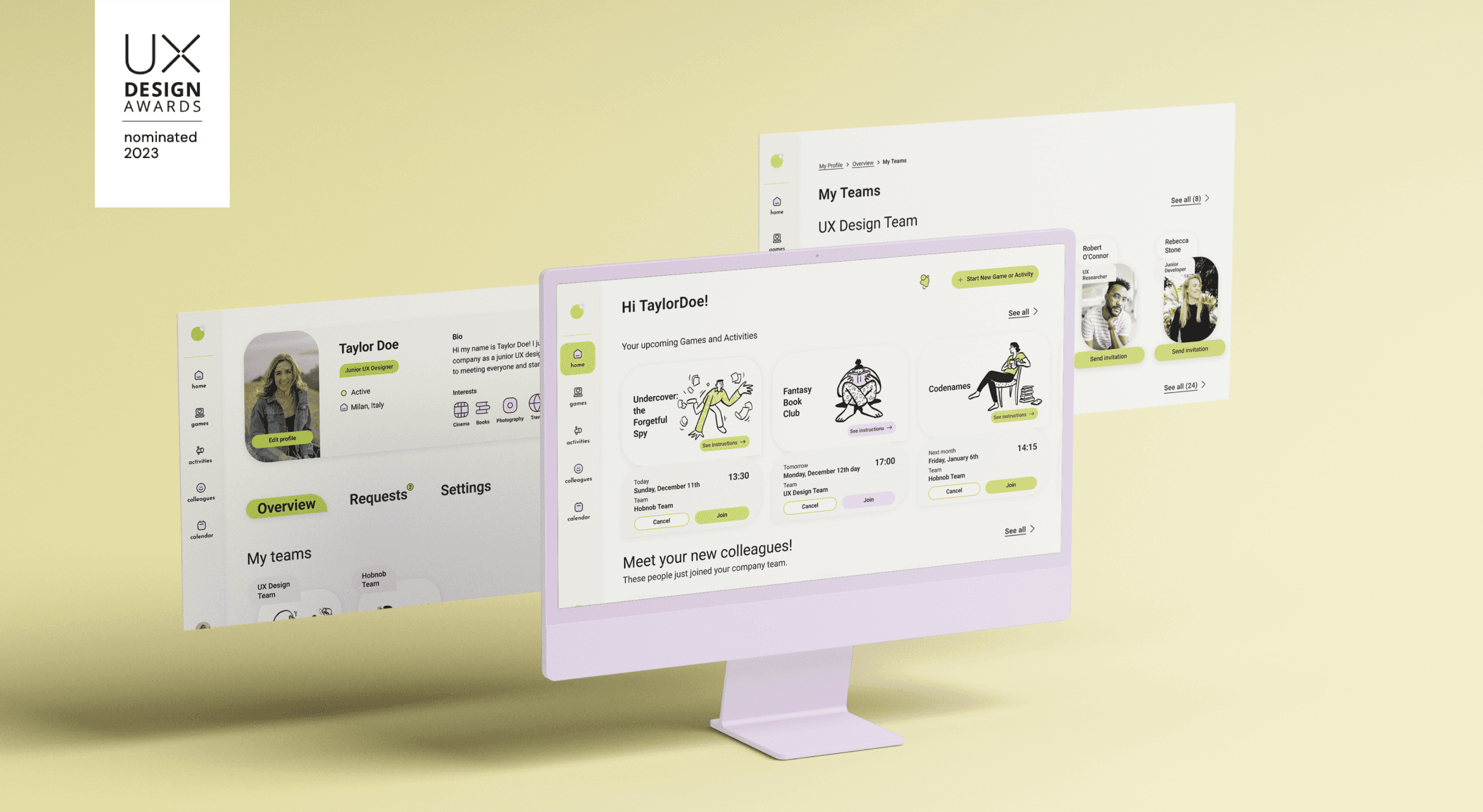 Hobnob is meant to increase social participation within new recruit in the team and strengthen informal workplace connections. Hobnob was nominated in the 2023 UX Design Awards under the Product UI category (Office Environment) in the New Talent division. The project was recognised for addressing the social challenges of remote onboarding and for its contribution to fostering engagement and workplace culture in distributed teams.